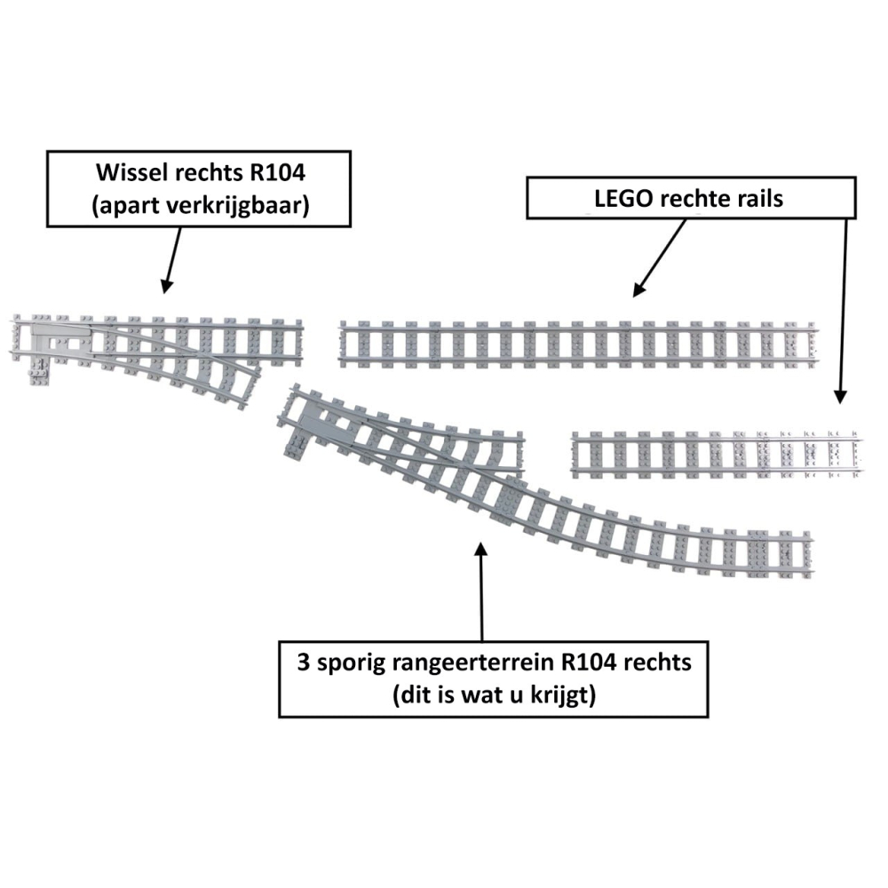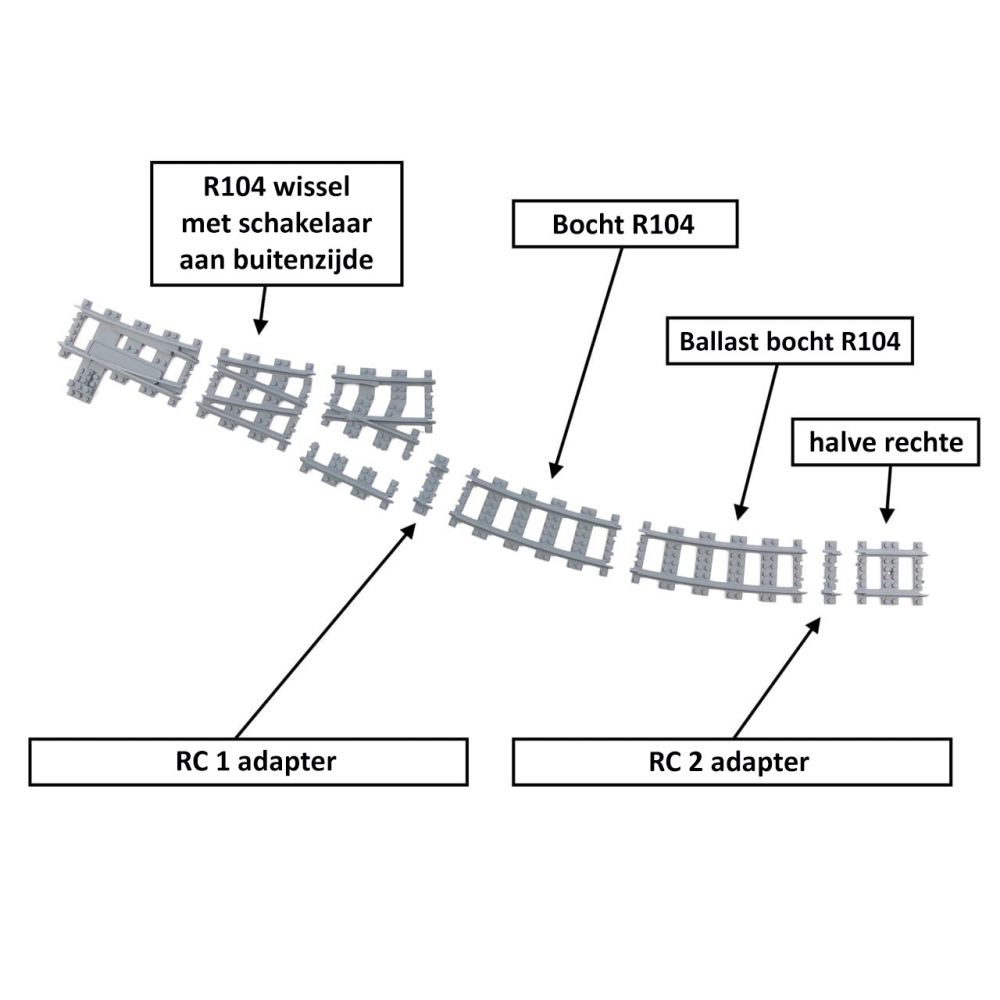 R104 is de afstand gemeten vanaf het midden van de cirkel tot aan het midden van de rails. Daarmee gebruik makende van de LEGO® stud als eenheid. Een LEGO® stud is 8mm(breedte en lengte van een 1x1 steen). De ruimte benodigd voor een volledige R104 cirkel kan uitgerekend worden middels de volgende formule: (104 + 4) * 2 * 8mm = 1728mm = 1.73m.(R + 4) * 2 * 8mm