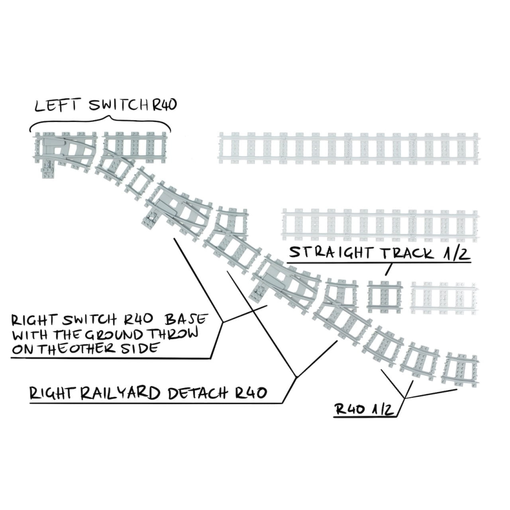 - Voeg voor elke extra tak een R40 Railyard Switch toe in tegengestelde richting aan de basisrichting van de 3-Track Rail Yard (d.w.z. Left Rail Yard Switches voor 3-Track Right Rail Yard en vice versa).