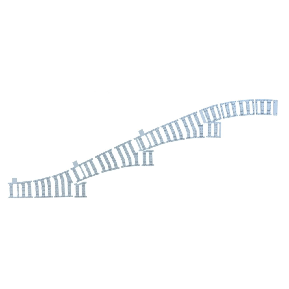 R104 is de afstand gemeten vanaf het midden van de cirkel tot aan het midden van de rails. Daarmee gebruik makende van de LEGO® stud als eenheid. Een LEGO® stud is 8mm(breedte en lengte van een 1x1 steen). De ruimte benodigd voor een volledige R104 cirkel kan uitgerekend worden middels de volgende formule: (104 + 4) * 2 * 8mm = 1728mm = 1.73m.(R + 4) * 2 * 8mm