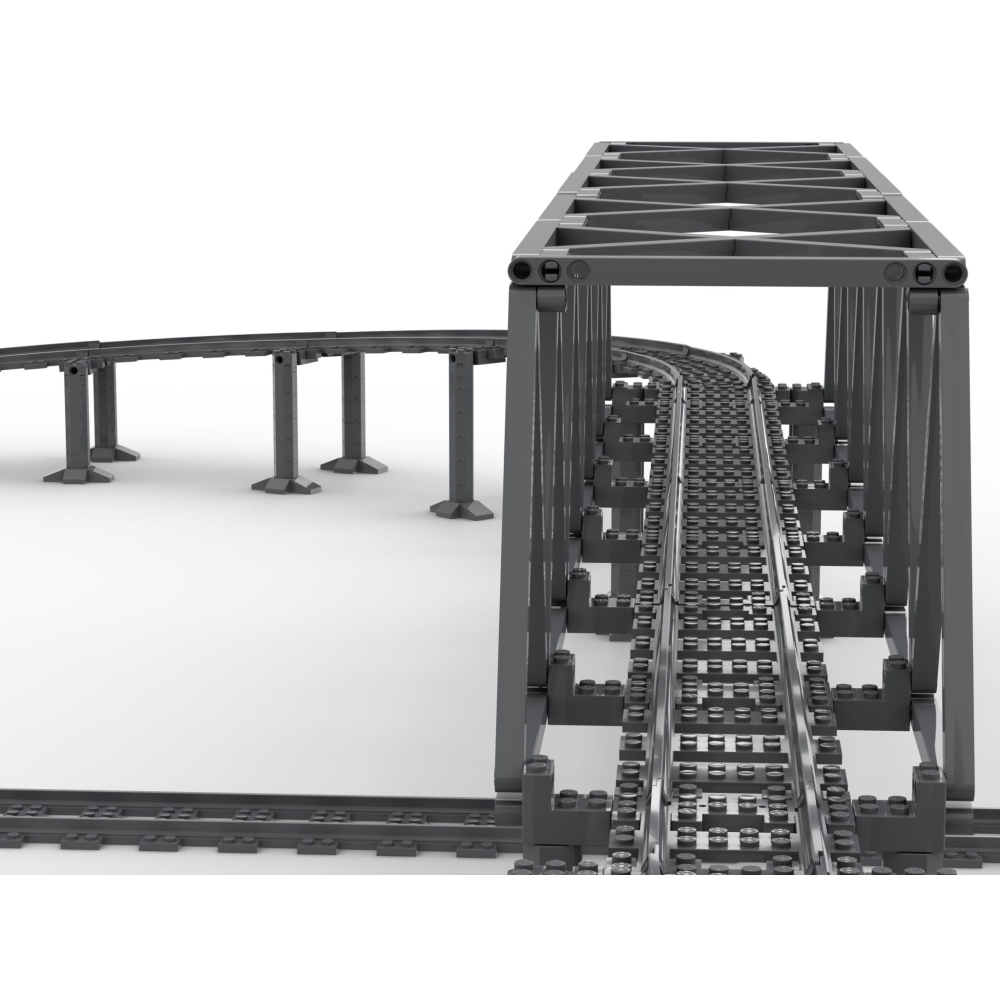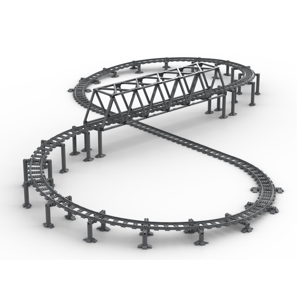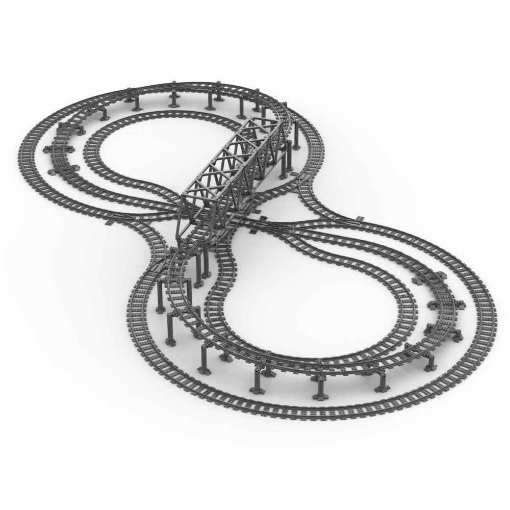 - Bevat alles benodigd om een verhoogde 'acht' vorm met brug pilaren, de brug zelf en alle sporen, rechten en bochten, te bouwen.