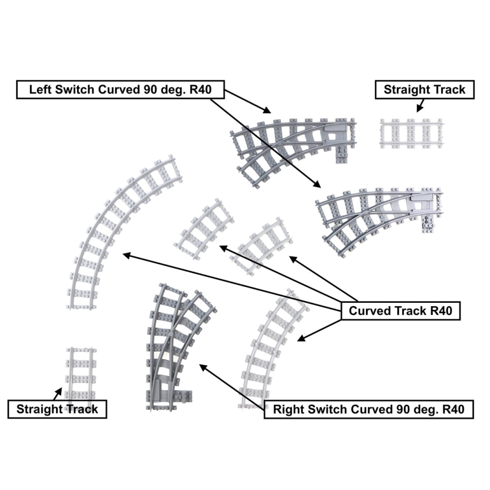 R40 is de afstand gemeten vanaf het midden van de cirkel tot aan het midden van de rails. Daarmee gebruik makende van de LEGO® stud als eenheid. Een LEGO® stud is 8mm(breedte en lengte van een 1x1 steen). De ruimte benodigd voor een volledige R40 cirkel kan uitgerekend worden middels de volgende formule: (40 + 4) * 2 * 8mm = 704mm = 0.7m.(R + 4) * 2 * 8mm