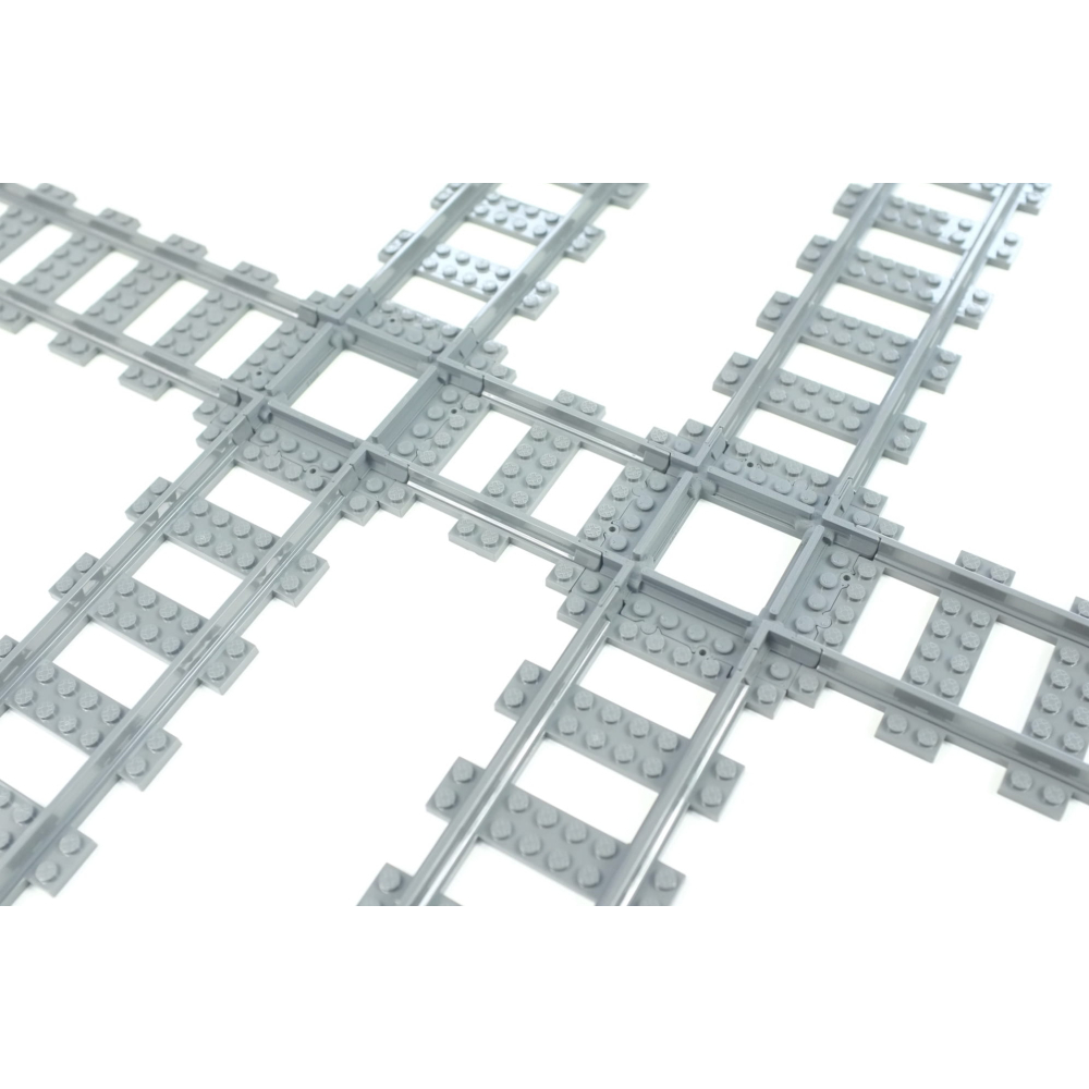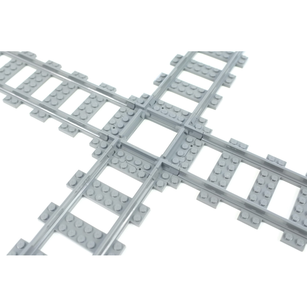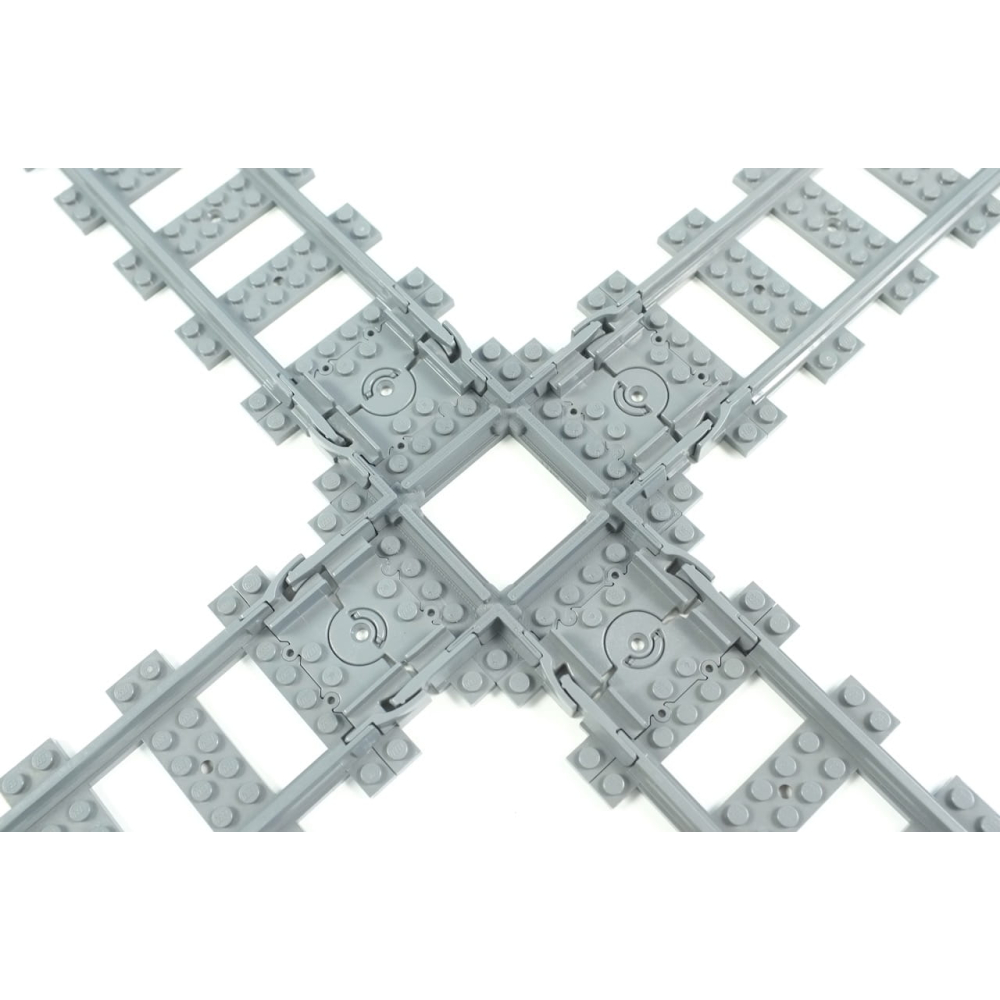 Deze kortere versie van de normale 90 graden kruising kan erg handig zijn in situaties met beperkte ruimte of bij het bouwen van complexe layouts. De lengte van de rechte rails is een Halve rechte rails (8 studs) .
