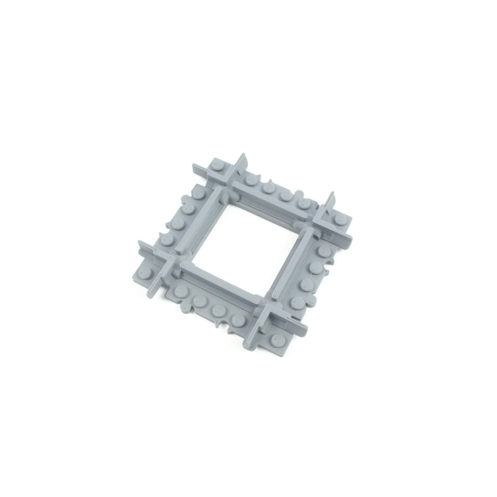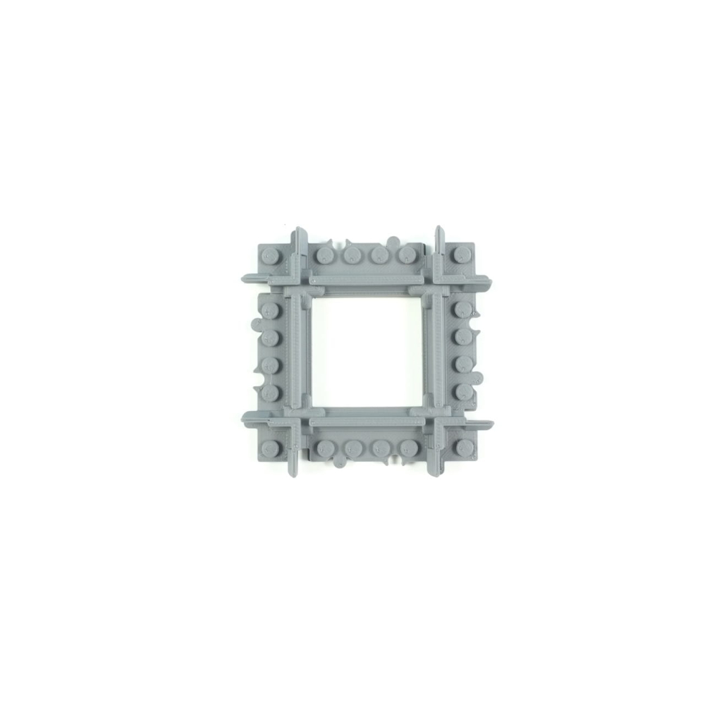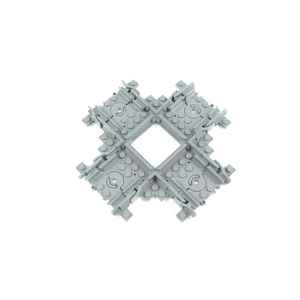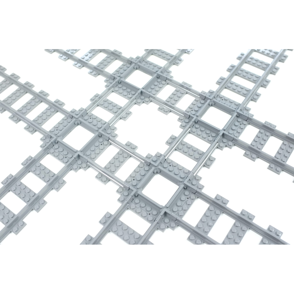 Deze kortere versie van de normale 90 graden kruising kan erg handig zijn in situaties met beperkte ruimte of bij het bouwen van complexe layouts. De lengte van de rechte rails is een Halve rechte rails (8 studs) .