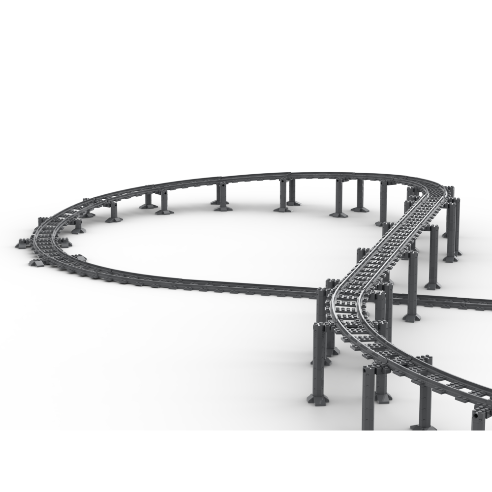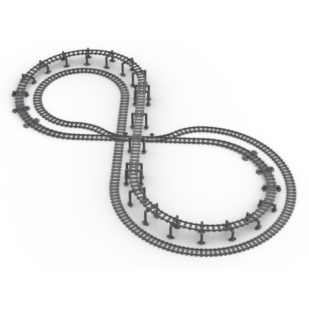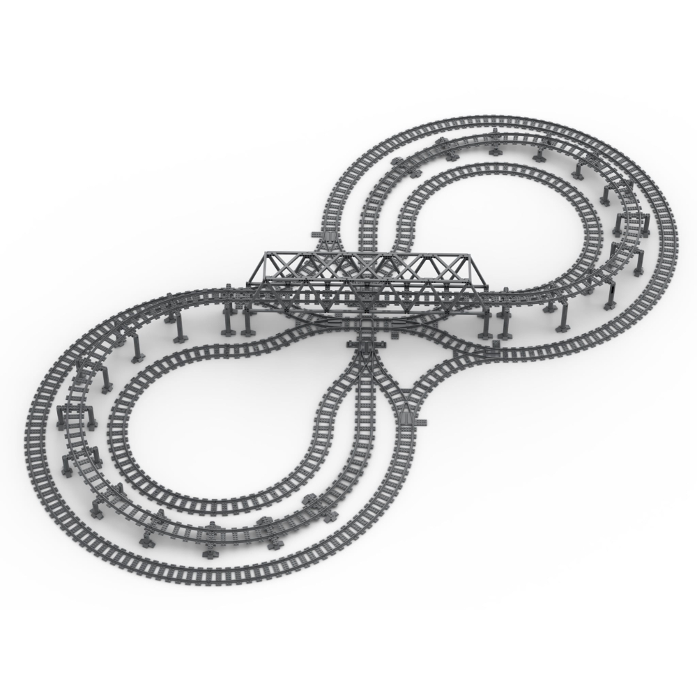 - Bevat alles benodigd om een verhoogde 'acht' vorm met brug pilaren, en alle sporen, rechten en bochten, te bouwen.