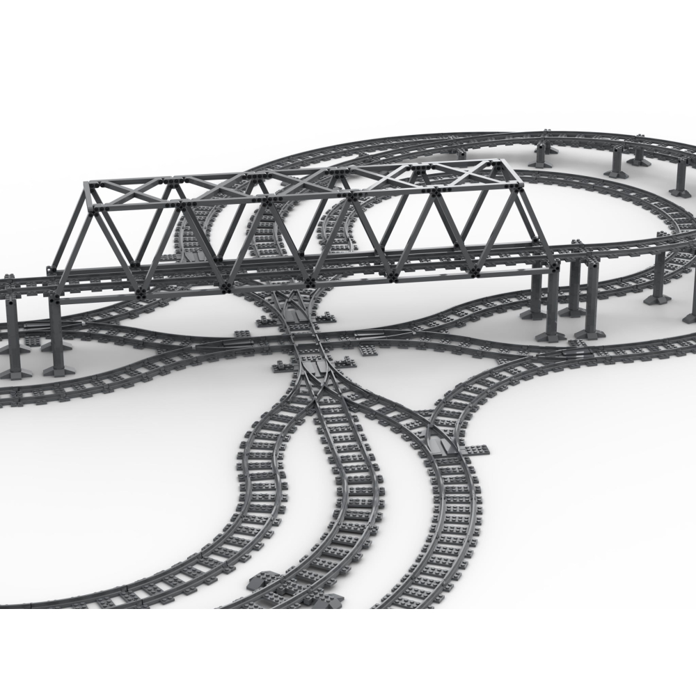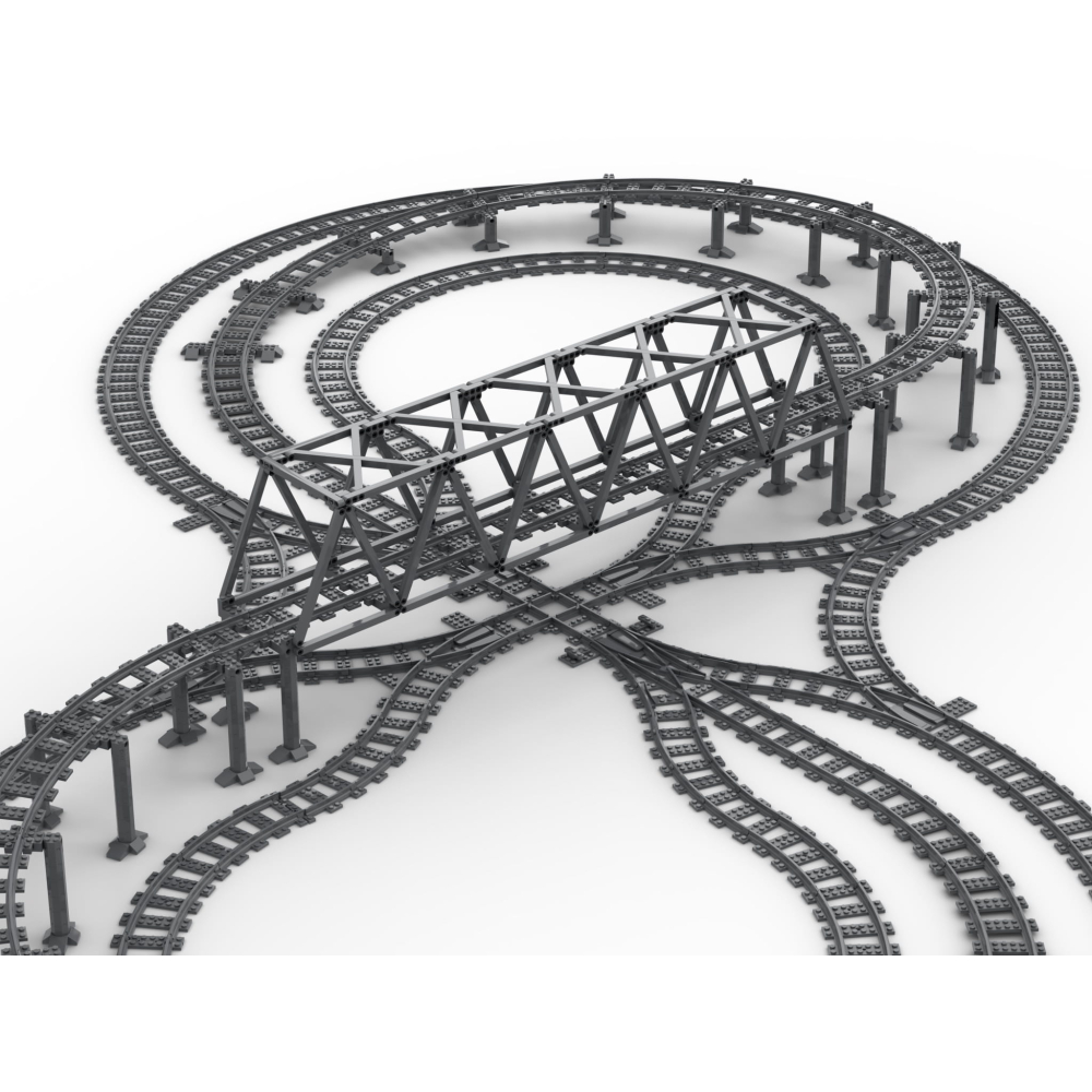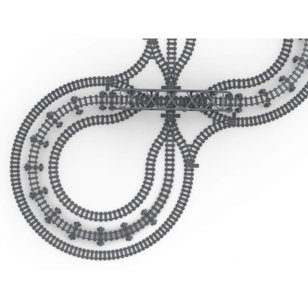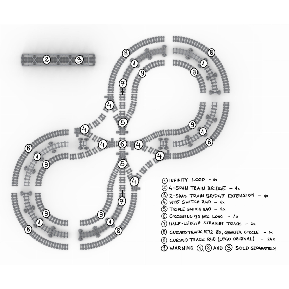 Om deze layout te kunnen bouwen zijn ook nog 24 stuks originele LEGO® R40 bochten benodigd. Deze zijn niet bijgevoegd.