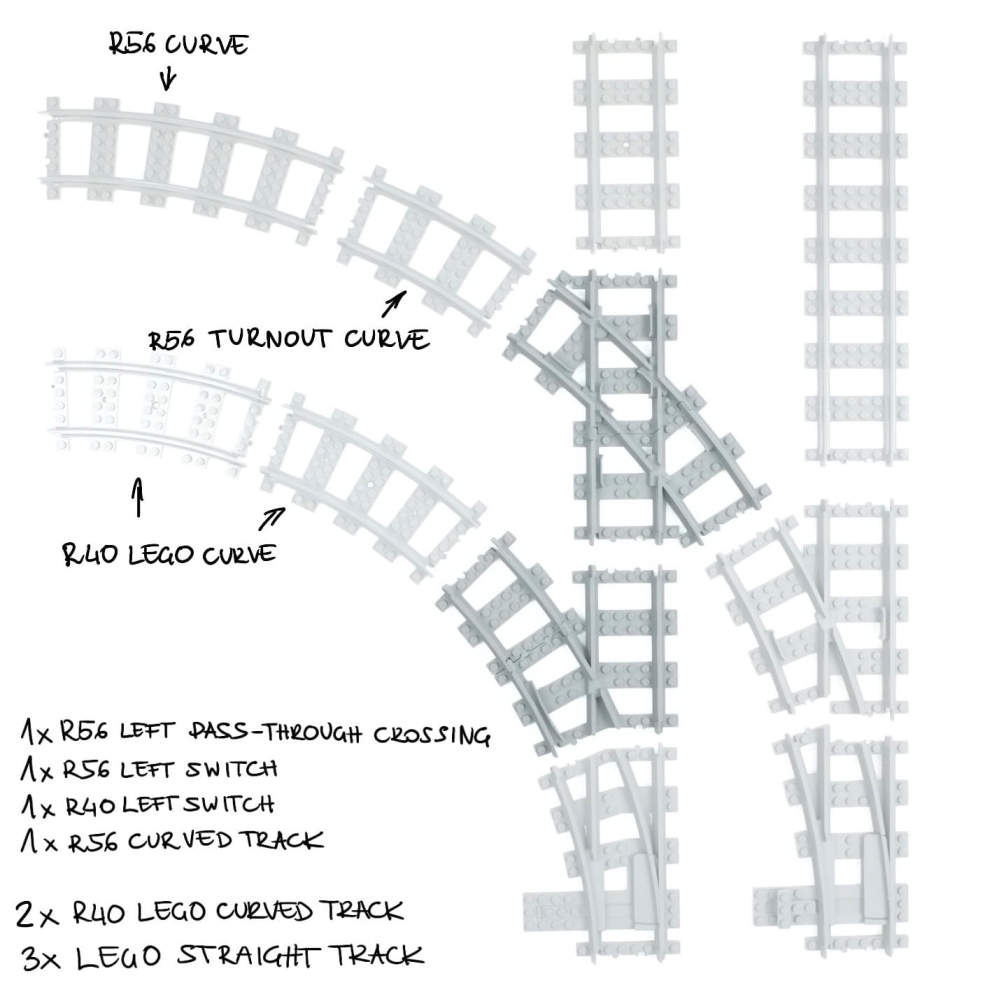 R56 is de afstand gemeten vanaf het midden van de cirkel tot aan het midden van de rails. Daarmee gebruik makende van de LEGO® stud als eenheid. Een LEGO® stud is 8mm(breedte en lengte van een 1x1 steen). De ruimte benodigd voor een volledige R56 cirkel kan uitgerekend worden middels de volgende formule: (56 + 4) * 2 * 8mm = 960mm = 0.96m.(R + 4) * 2 * 8mm