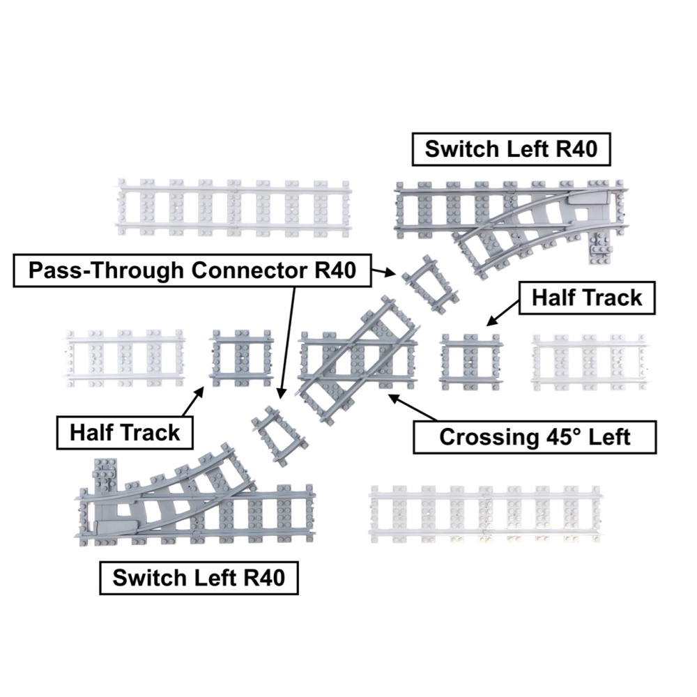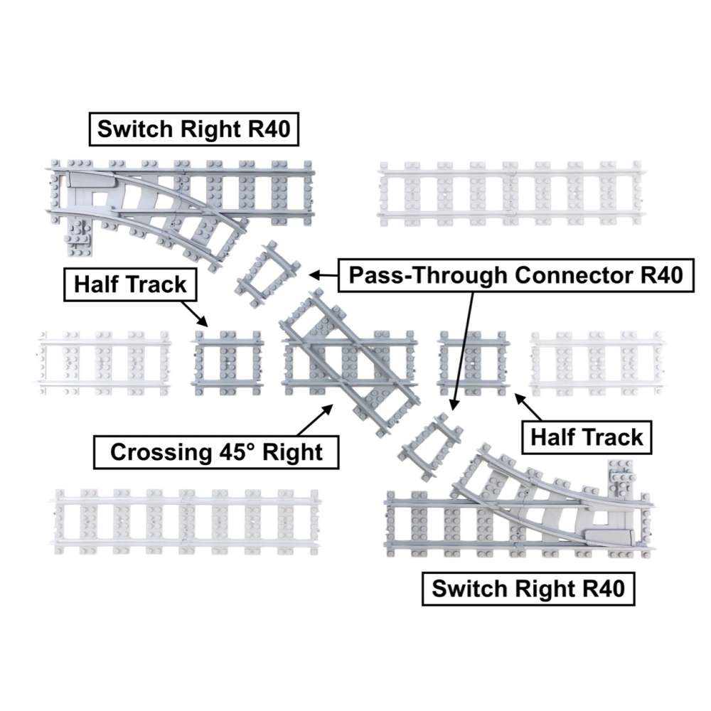 R40 is de afstand gemeten vanaf het midden van de cirkel tot aan het midden van de rails. Daarmee gebruik makende van de LEGO® stud als eenheid. Een LEGO® stud is 8mm. De ruimte benodigd voor een volledige R40 cirkel kan uitgerekend worden middels de volgende formule: (40 + 4) * 2 * 8mm = 704mm = 0.7m.(R + 4) * 2 * 8mm