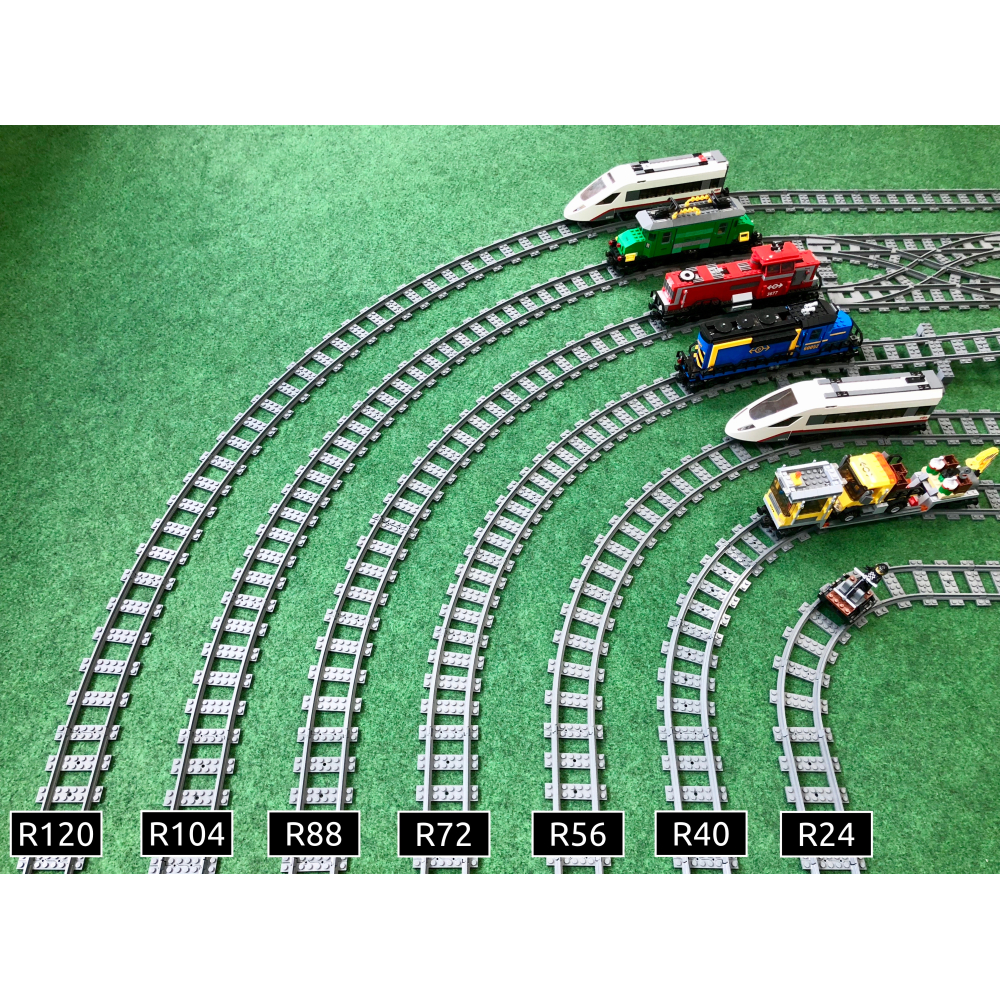 Bocht past precies parallel aan bocht R40 met een tussenruimte van 8 noppen zodat treinen elkaar veilig kunnen passeren en treinbanen binnen een standaard geometrie blijven waardoor rails goed op elkaar aansluit. Past ook precies parallel aan een R32 bocht zonder tussenruimte(0 noppen tussenruimte)