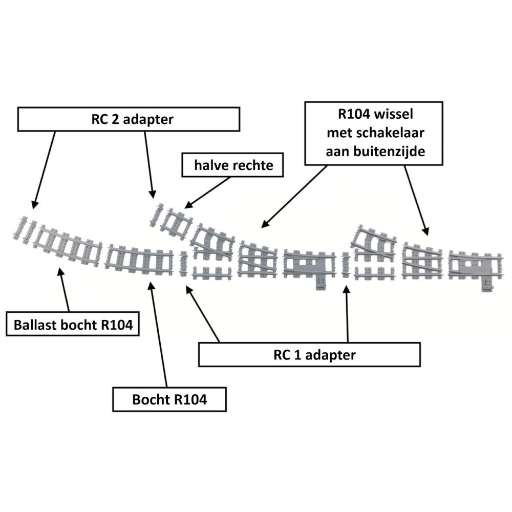 R104 is de afstand gemeten vanaf het midden van de cirkel tot aan het midden van de rails. Daarmee gebruik makende van de LEGO® stud als eenheid. Een LEGO® stud is 8mm(breedte en lengte van een 1x1 steen). De ruimte benodigd voor een volledige R104 cirkel kan uitgerekend worden middels de volgende formule: (104 + 4) * 2 * 8mm = 1728mm = 1.73m.(R + 4) * 2 * 8mm