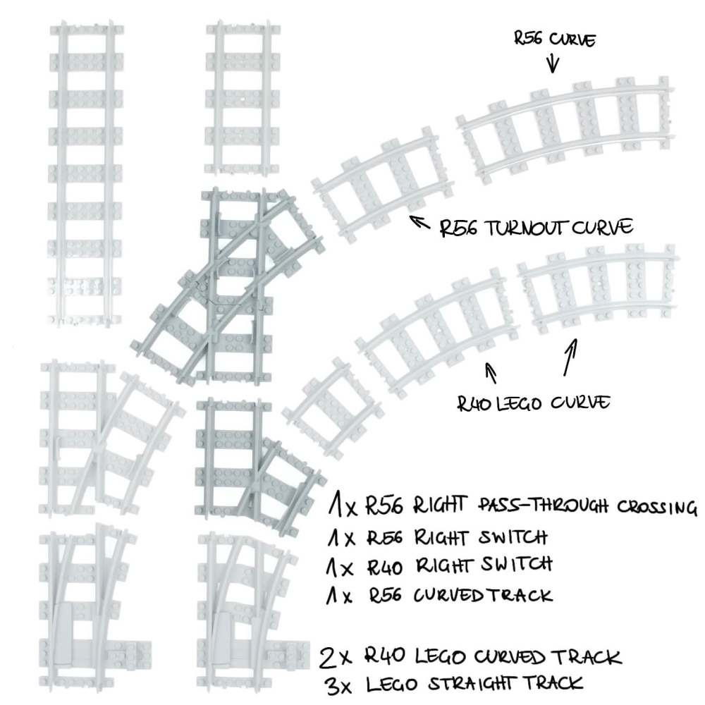 R56 is de afstand gemeten vanaf het midden van de cirkel tot aan het midden van de rails. Daarmee gebruik makende van de LEGO® stud als eenheid. Een LEGO® stud is 8mm(breedte en lengte van een 1x1 steen). De ruimte benodigd voor een volledige R56 cirkel kan uitgerekend worden middels de volgende formule: (56 + 4) * 2 * 8mm = 960mm = 0.96m.(R + 4) * 2 * 8mm